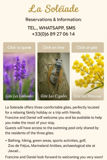 Renseignements , réservation , Mail : lasoleiade83@gmail.com ,TEL, Watssap, SMS (33) 06 89 27 06 14